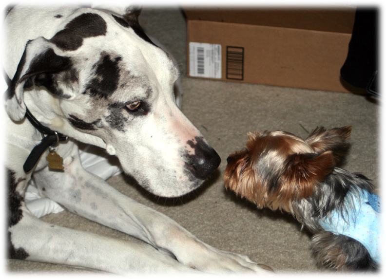 This past weekend we had a visitor come to stay with us. She’s a little Yorkshire Terrier named Gracie who is a bundle of energy. She stayed with us once before, but during this visit she really seemed to feel more at home. Though still a bit wary of Shakti’s large paws, she proved herself fearless by running in front of Shakti and barking to try and get the Dane to chase her. When she succeeded, she bounded to the couch, jumped up on it, and headed straight up the pillows or armrest so she could meet Shakti nose to nose. A few quick licks to the big black nose, and she was on the move again.