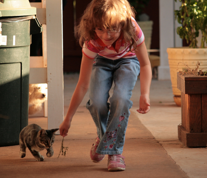 Papa: She says she likes it when Kate visits because she gets to play with her. The kittens like her a lot too. They enjoy exploring the backyard with her.