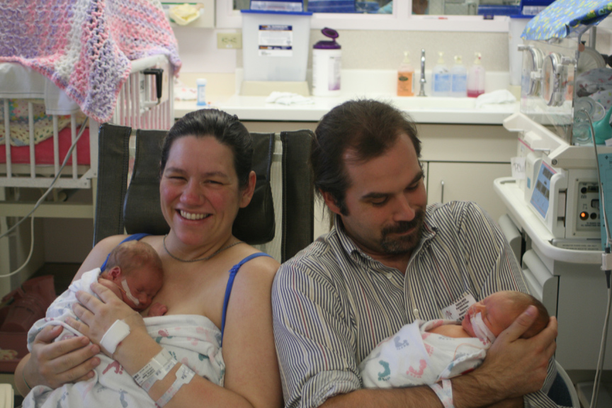 Taken to the NICU, each boy lay alone and separate from his brother unable to feel him or hear his cries. That changed when both boys were upgraded to Room D, and they lay in adjacent cribs. Yesterday, before Mary came home, she slowly made the painful walk to the NICU so that she could sit with the boys, and our entire family was reunited again for the first time since August 1st.