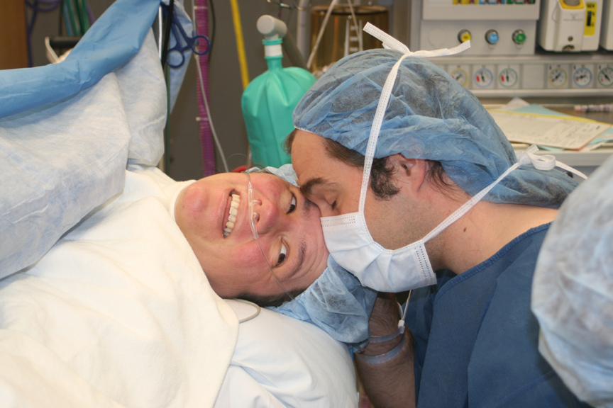 The next hour or so was a blur of waiting and activity. I was quickly derobed, clothed in a lovely hospital gown and put on a bed to wait with Puck and Grandma Myrtle at my side. In no time, I soaked the sheets from my shoulders to my toes. When we brought this to the nurses’ attention, they seemed surprised but quickly changed the sheets right under me. Monitors were placed on my belly for each of the boys and constantly adjusted as the boys moved around. They checked my blood pressure and took my blood. I felt extremely parched and had since my water broke, but I had avoided drinking anything because I might be doing a C-section.When the Perinator (the perinatologist) arrived, she outlined our options for us. Alexander (Baby B) looked like he would be breech, but they still gave us the option of a C-section (safer for the boys) or a regular delivery (a bit safer for me). After a brief discussion, we gave the go-ahead for surgery, and a flurry of activity occurred – navy scrubs for Grandma Myrtle and Dad, then Mom moved to a gurney and rolled into the operating room for her spinal. Finally, we were all in the operating room together, and I was sufficiently numb.