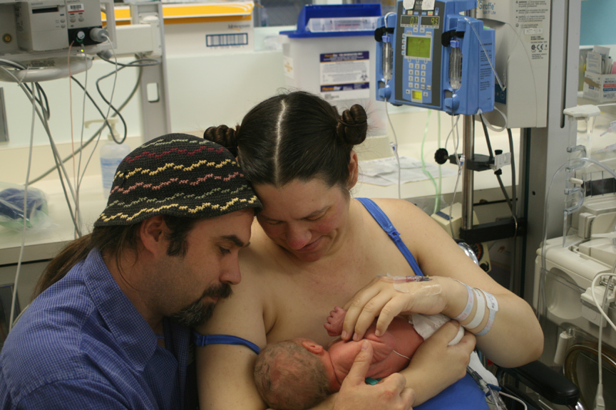 A blue sheet blocked my view of the belly, Grandma Myrtle had the camera ready (though we had told her we didn’t want photos of the birth itself), and Dad was right by my side to hold my hand. The delivery itself was a blur of anticipation. As they got ready to pull Dominic from my womb, I changed my mind and asked Mom to go ahead and take photos, and the Twin-Daddy poked his head over the sheet-shield to see our son Dominic pulled into the world (graphic photo). He was whisked away to be poked and prodded. When Alexander came next, there was both silence and activity, and he disappeared from the room without me seeing his still, blue form. Grandma followed Alexander for us, and they had him breathing again in seconds. Still, the worry takes your breath away, and then the joy of having two little sons fills the world.*This post was started on August 5, 2010, and I finished it and added photos on February 26, 2011. I have decided to post it with date of August 5th.
