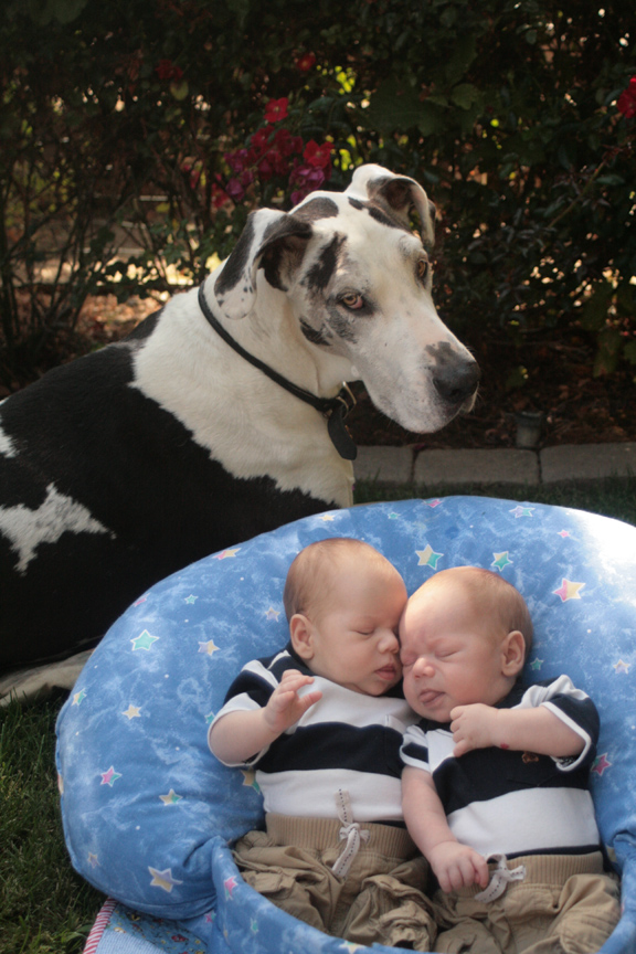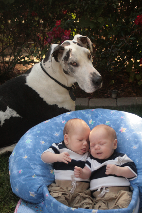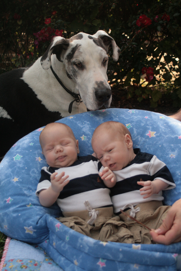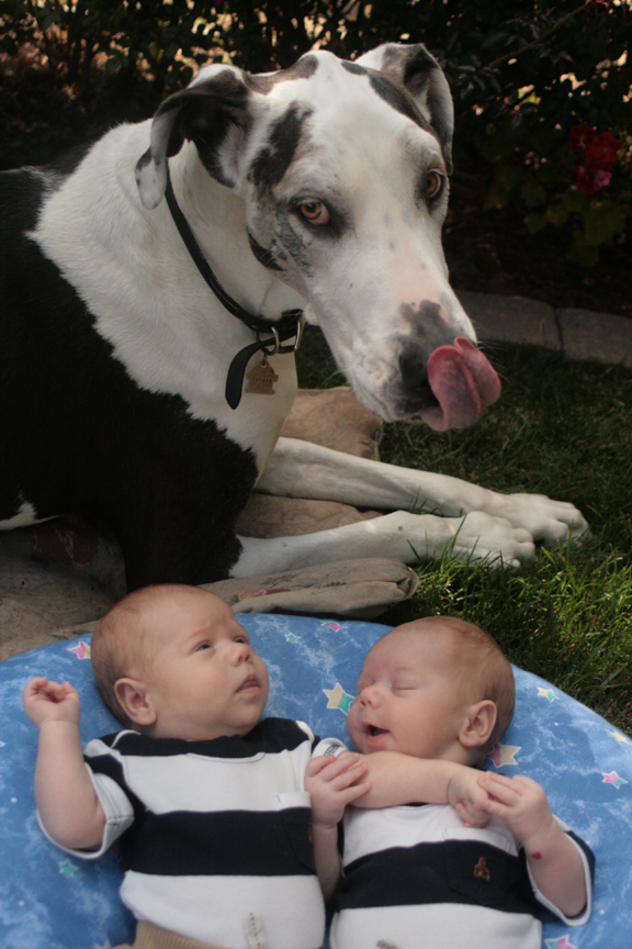 We took some photos of our cubs with their Great Dane on Sunday. Shakti has taken the boys arrival in stride. She sometimes comes over to give them a sniff or to lick their cheeks. If they are crying, she occasionally comes to check on them, but it is more common for her to either keep on sleeping or to go back to our bedroom to take a break from the noise. (Click on the images to see a larger version of each. Click on the back button to return to this page.)