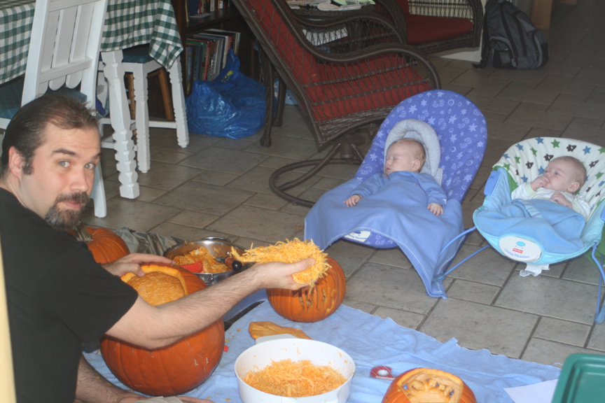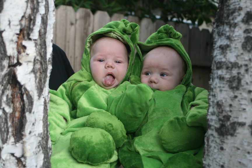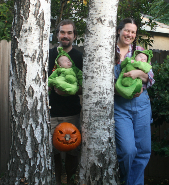 - First Halloween: Dad showed them how to carve jack-o’-lanterns, and they got their first taste of pumpkin (see photo above). They have not yet seen the whole pumpkin-to-pumpkin-pie process as we have a lot of pumpkin guts to turn into goo. Dom and Alex dressed up as a matched set of two peas in a pod and went twin-or-treating on our street – stopping by houses to show off their outfits and be admired but without candy involved (perhaps that should be trick-or-twinning?). They were very good-humored about being carried from door-to-door and smiled at by the neighbors. We also had a huge number of trick-or-treaters this year, and we had to rush out and buy more candy (Puck was down to the last piece by the time I made it home). Shakti was a big hit with many of the children who remember seeing or meeting her on her many walks with Grandma Myrtle and Papa.