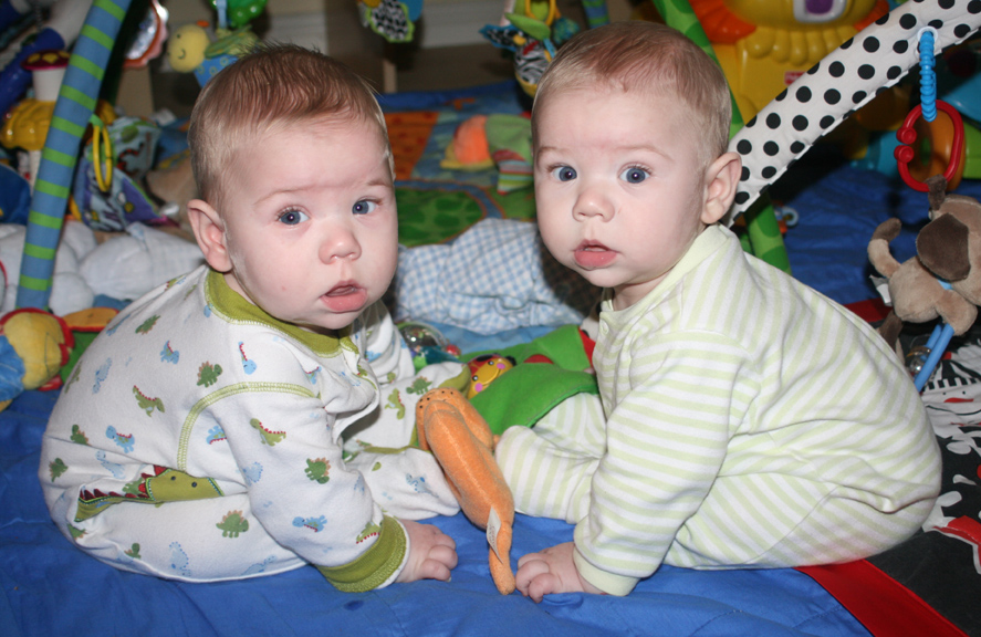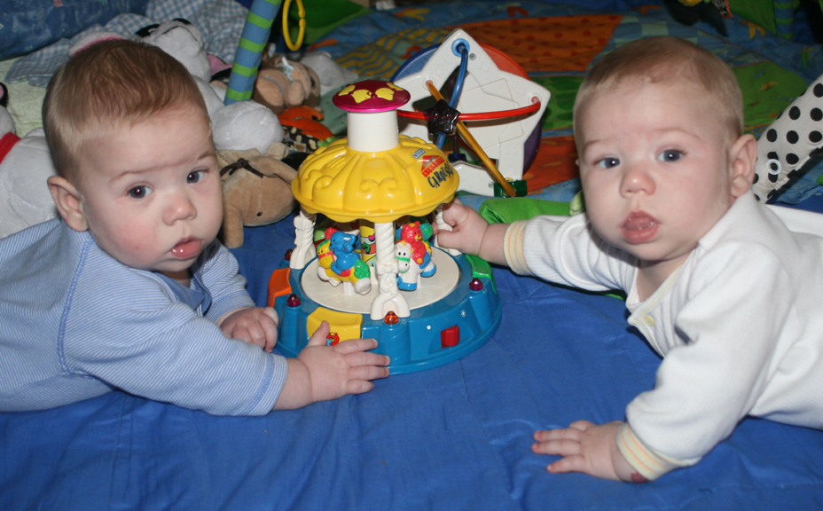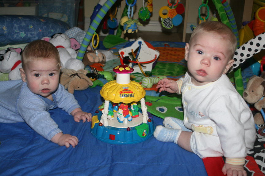 Both boys rolled over twice on their own (Alex first, then Dom)! Dom started hitting buttons on their carousel toy! Both Dom and Alex enjoy trying to roll their RRRRs (they blow bubbles). Plus, Alex slept from 9 PM until 7 AM, and Dom only woke once at 3 AM!