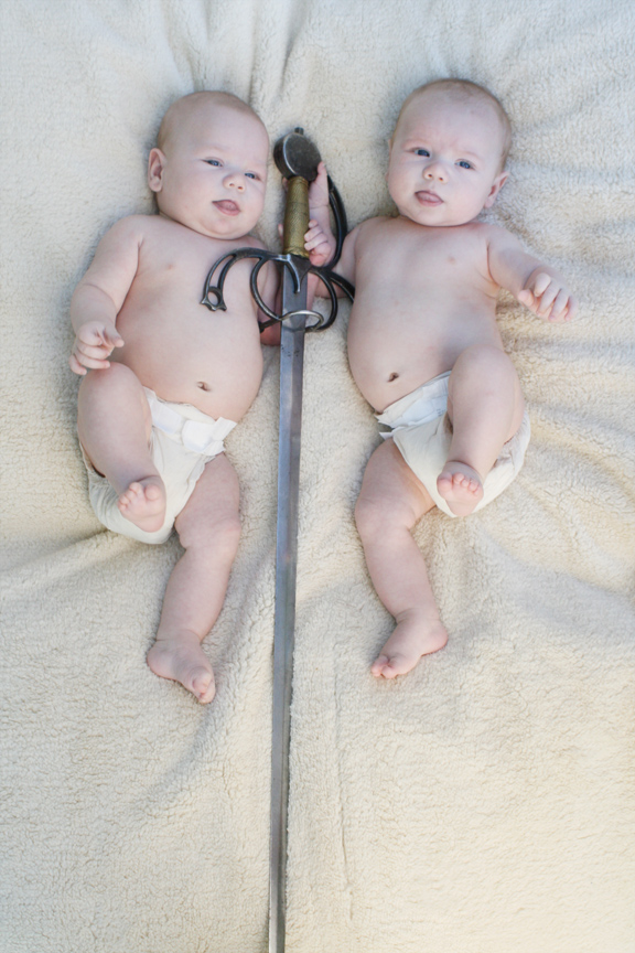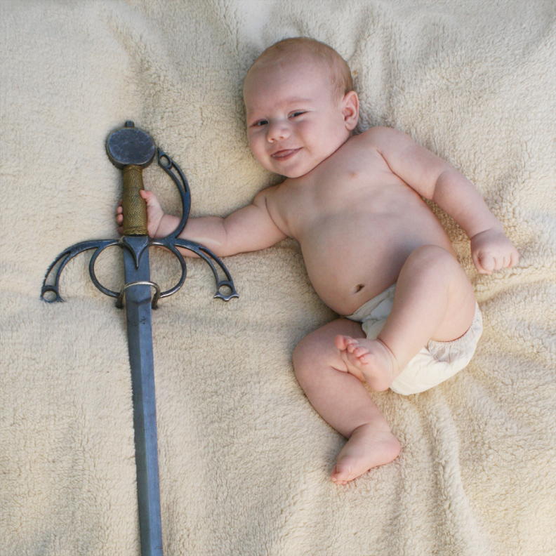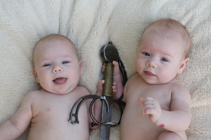 With our boys just over 3 months old, we took some photos of Dom and Alex with Puck’s favorite sword. We were pleased that they would hold onto it and that we were able to get photos of the two of them together with the sword. We also got some close-ups of our boys in blue.