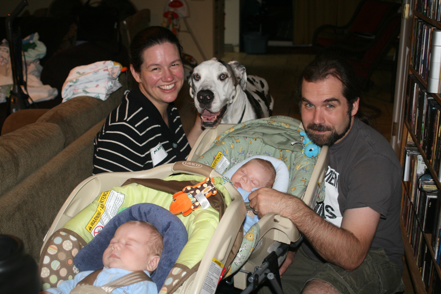 Our beloved Great Dane Shakti passed away Monday afternoon while Puck was home taking care of Dom and Alex. She was a treasured member of our family and a gentle soul. I was pretty amused this past year to discover that our lovely Dane trumped the hugely pregnant woman and even the twins for attention when we were out on walks. Shakti had just turned 11 years old in early November. I am so grateful that she lived long enough to meet Dom and Alex, give them a few kisses and have some photos with them. She is still greatly missed, and every time her bell on the back door jingles, I imagine her here watching over all of us.