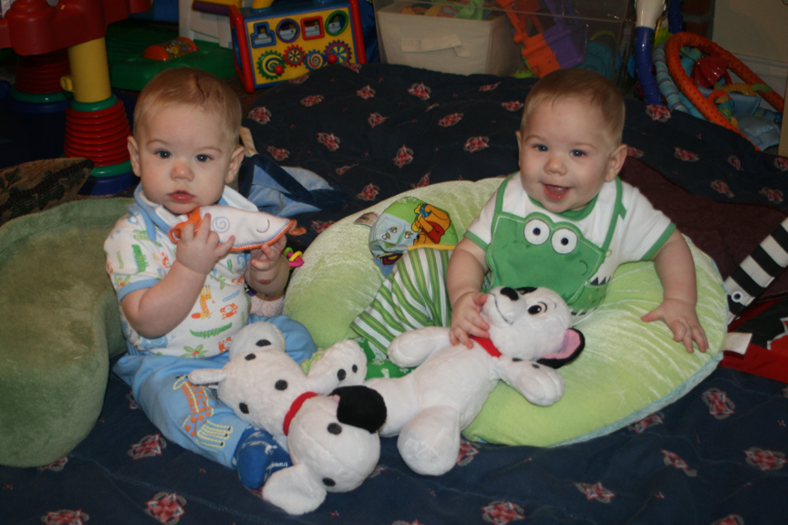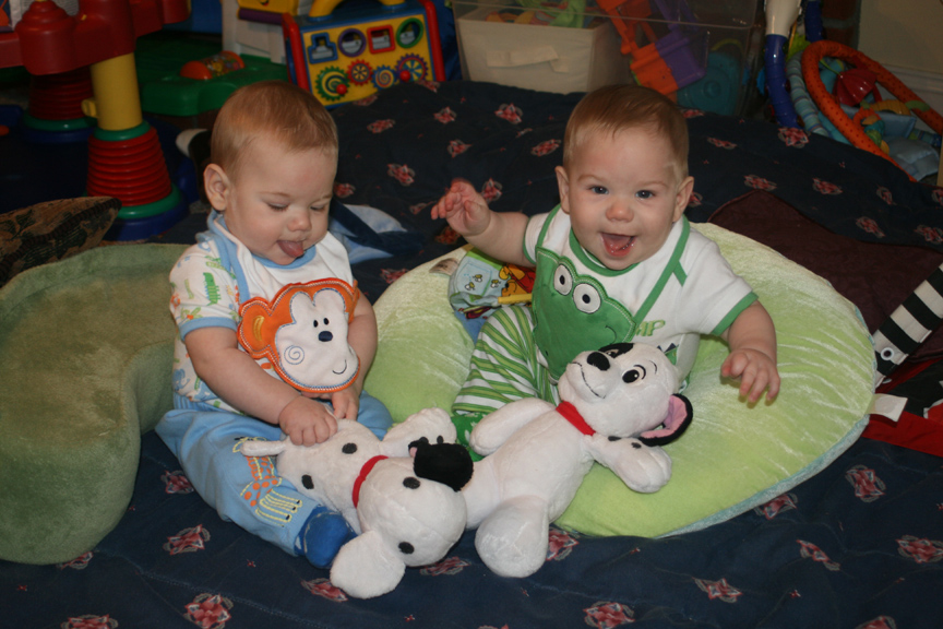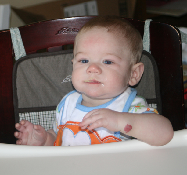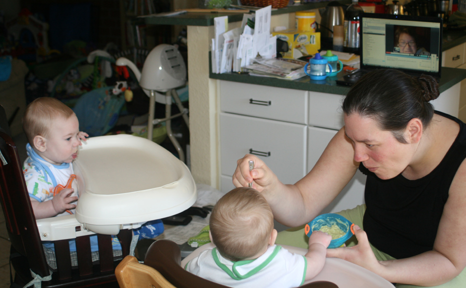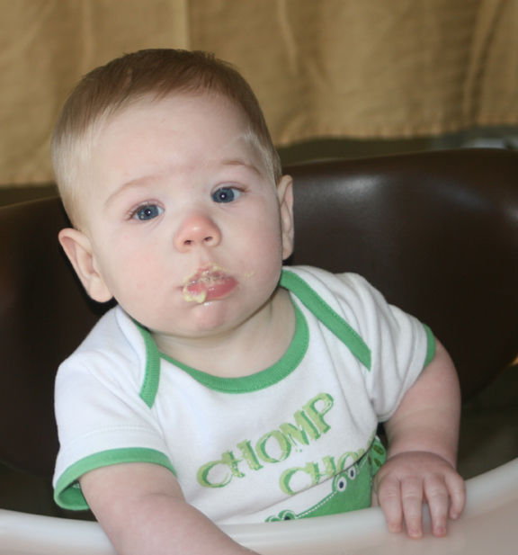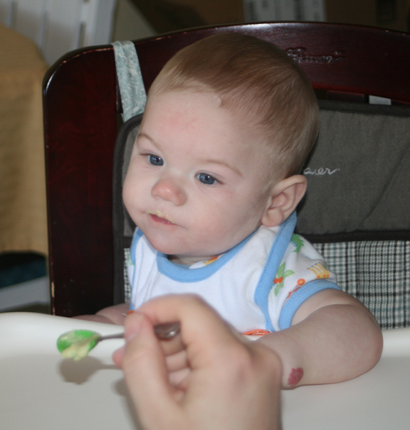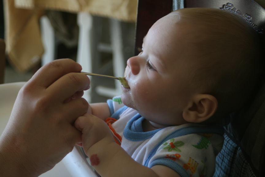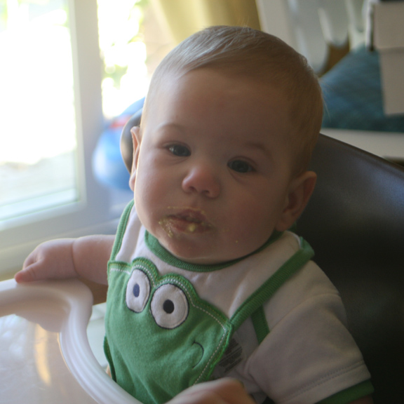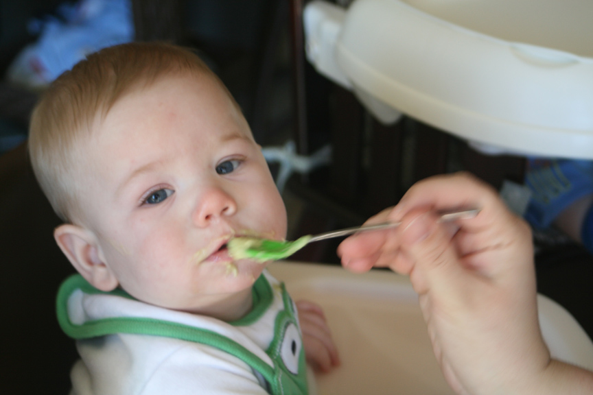 This afternoon Dom and Alex tried a new and slightly thicker food – avocado (mashed and mixed with breastmilk). Dom really loved the avocado and was determined to help Mom give him each spoonful. Alex tended to taste the avocado and then push most of it right back out of his mouth.