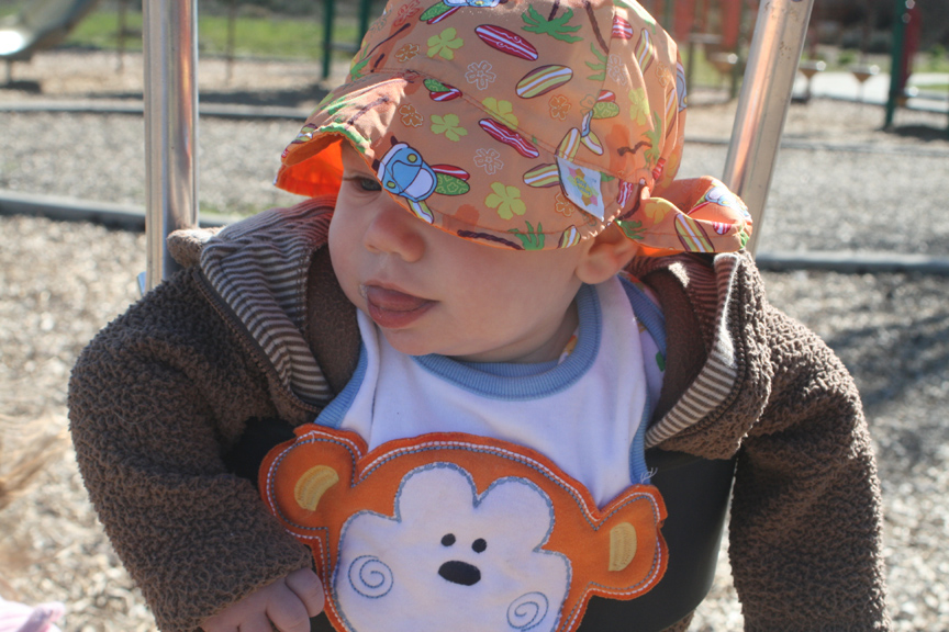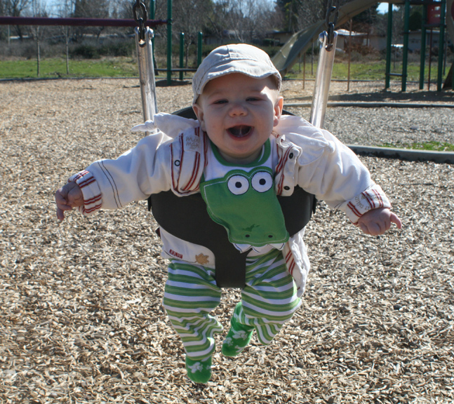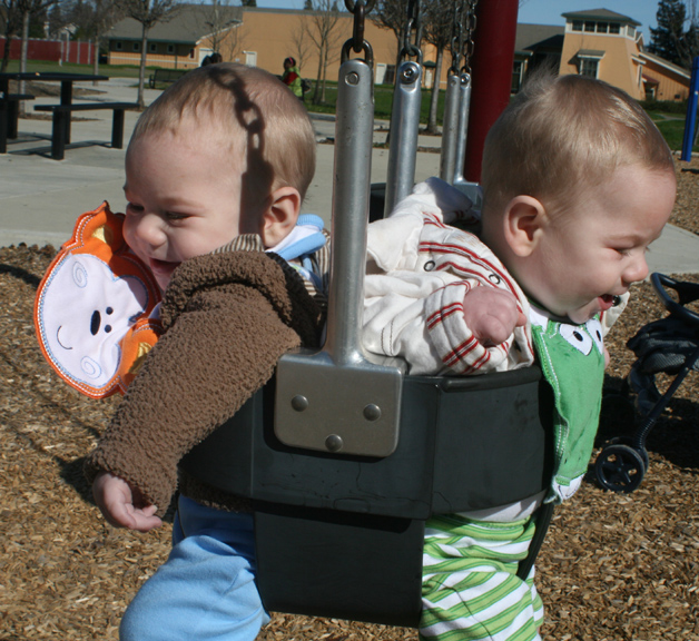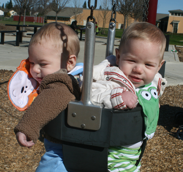 Today was absolutely gorgeous and sunny (77 degrees), so the boys and I walked to the Fort Natomas park where Dom and Alex played on the swings. A two-year-old girl named Savanna came over to ask questions about the boys and to help push them in the swings. She was very sweet.