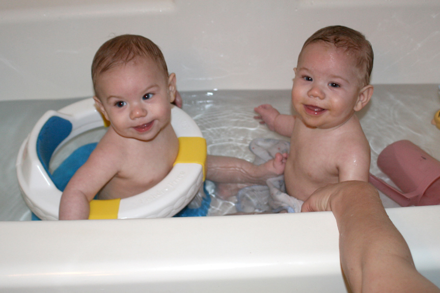 Our little jailbirds had another new experience yesterday. They got to take a bath together in the big tub. Dom got to use the bath seat since he doesn’t sit up quite as well as Alex, and Mommy helped Alex stay sitting. Dom almost immediately felt safe in the bath seat and proceeded to play with the various toy animals, but Alex clung to me for a bit. I wrapped my arms around him to make him feel secure, and then he also started to explore and play a bit. He thought the pitcher I use to pour water on them was more interesting than the toys. Dom and Alex seemed to enjoy having a bath together, and they chatted a bit.