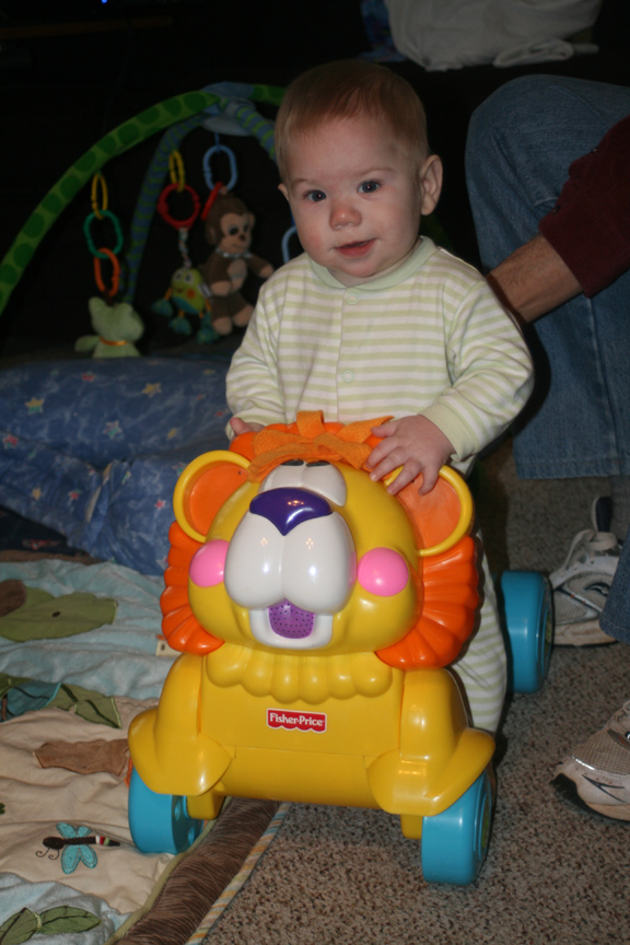 Dom has not yet mastered sitting up on his own. He does like to practice getting on all fours with his feet under him, and sometimes he looks like he might either sit or take off crawling. We’re still waiting to see where he goes with it. However, he doesn’t expend as much energy keeping himself in a sitting position, and when he accidentally topples, he is quick to get upset and cry for someone to help him sit again.
