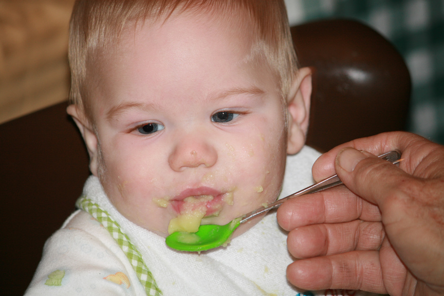 The boys ate A LOT of sweet potato tonight. I made more than I thought they would eat, but I was wrong. While both boys cleaned their bowls, Dominic continues to dominate in the field of eating. He takes his eating much more seriously right now. It is the rare bite of food that escapes back out of his lips with the help of an errant tongue, and you have to keep an eye on him because he’ll eagerly open his mouth for more food before he’s even swallowed all of the previous spoonful.A New Trick
