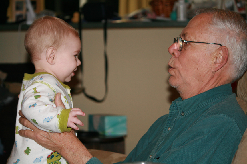 The boys sure love to watch and play with their Papa, and he was teaching both of them to slap his hand with theirs (low high-fives) yesterday. I love to watch them as they gaze at him adoringly. Tonight, while sitting on Papa’s lap and watching some Sesame Street songs, Dom even started dancing a wee bit and singing (vocalizing) along. He’s been quite the chatterer of late. Alex has also been “talking” more.