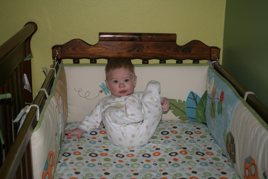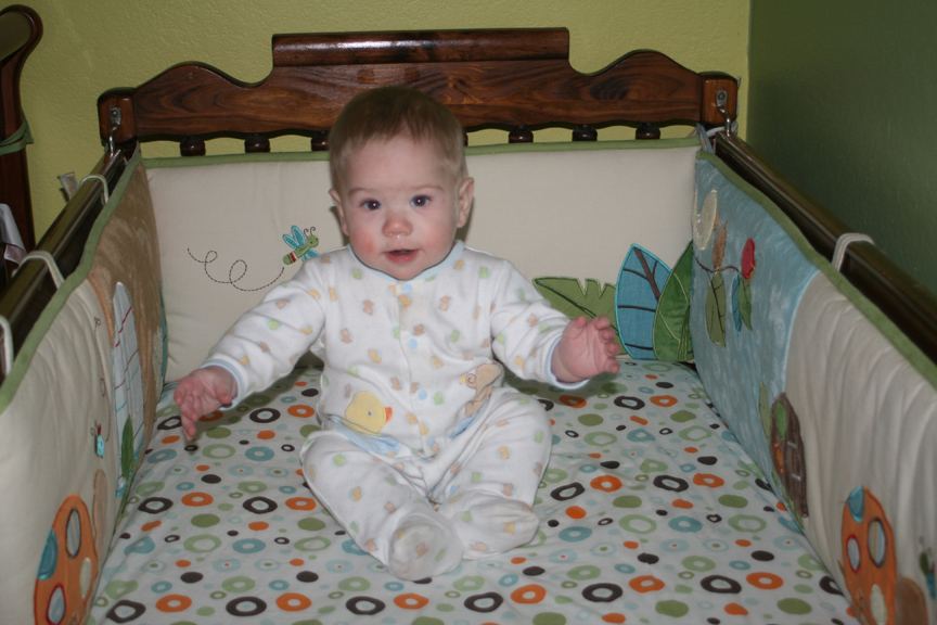 The boys continue to enjoy the time with their Papa, and they are still working on crawling (the Twin-Daddy will be glad they didn’t suddenly master that while he was away). Alex has been very excited about sitting up on his own, and he has a lounging pose that he can reliably get into. This afternoon when I put the boys down for their nap, I peeked in on them after a little bit to find Dom sound asleep and Alex happily sitting up in his crib and waving his arms! I (of course) had to go get Papa to see him and snap a shot before resettling him in his crib for his nap.