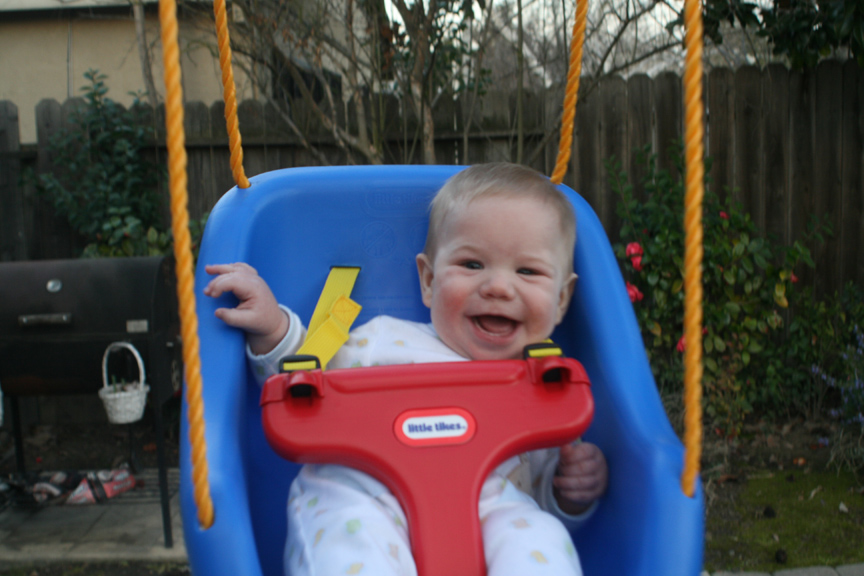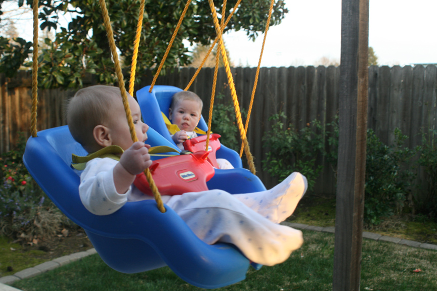 Papa had a surprise for the boys today too. We had one swing for the boys that I had been hoping Papa would help us put up, and Papa brought home some supplies to do so along with a second swing. He got everything put together (a process involving saws, drills, hooks, etc.), and Dom and Alex got to try out their very own swings in the backyard. I’ll let the photos tell you what they thought of their new swings.