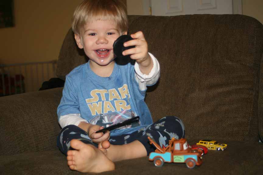 In the late morning, I set us up for Dom’s haircut. He didn’t really want me brushing his hair again, but when he had a comb of his own to hold, he at least let me start brushing and cutting. He wasn’t the happy camper he used to be, but we did manage to get through the haircut without too much drama. They both enjoyed watching “Cars” while eating snacks and coloring a picture of a car–though Dom started eating a purple crayon when I was paying too much attention to the back of his hair.After their nap, I had the laundry sorted and arranged so that the boys could help with it. First, Alex and Dom carried the towels form the dryer to the couch. Then, they helped push the washed clothes into the dryer, and finally, they put all the clothes in the basket into the washer–a more difficult job because they have to go on their tippy-toes to push the clothes over the edge into washing machine. They did a great job!