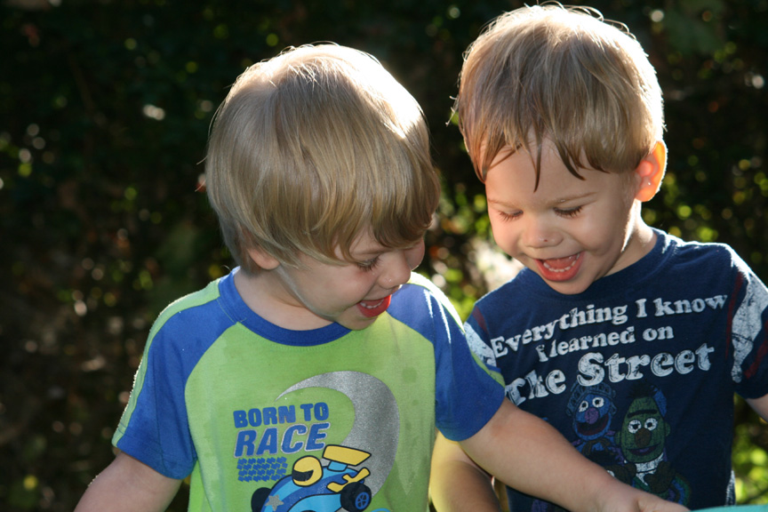On Monday, we headed to the park behind the Fort Natomas park, and Alex and Dom had a great time climbing up all sorts of ladders and climbing walls to go down the slides. They climbed up one metal ladder that went straight up for the first time, and they kept going back to go up it again. The only problem was that they weren’t very patient with their brother going up ahead of them. In fact, Dom tried to help Alex go up faster, but he was pushing his feet off the rungs instead of helping him up. I had the role of ladder traffic cop and fortunately prevented any major accidents.