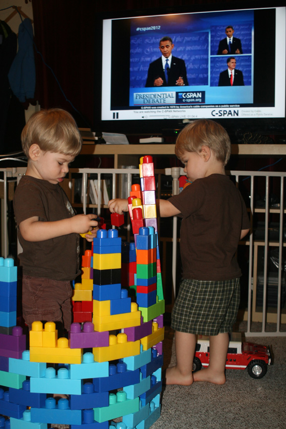 In the afternoon we danced a little, jumped a little, and colored robots and dinosaurs. Dom pulled everything out of the hallway cabinets and then wanted to climb inside. Alex soon joined him, and they pretended to sleep and had fun opening and closing the doors. They also put the letters “C” on their heads as “hats” and tried to give me a C hat too. After work, Puck got to join in on the coloring. We also read “The Little Old Lady Who Was Not Afraid of Anything” right before dinner, and Puck got to see how the boys do the gestures and tell us what comes next. Alex was particularly engaged. After dinner we played with megabloks while watching the presidential debates. Dom and Alex had a good time building and destroying towers, and then they also helped put all the pieces back together inside the tub. Dom even picked up a bunch of the tractors, cars, and trucks and lined them up on the shelves.Bedtime