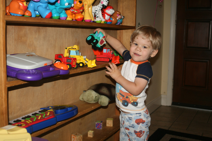 The guys sat on Puck’s lap for their final book of the night “Big and Little,” and they seemed to almost identify the two words on the pages. They really enjoyed the book, and afterward I rocked Alex in my arms while Puck rocked Dom in the rocking chair. They sang along with him again for “Twinkle, Twinkle, Little Star.” After we tucked them in their beds and started to leave, Dom suddenly stood back up and said, “Help.” I asked him what was wrong, and he said “Diaper.” I didn’t think he needed a diaper change, but I went ahead and got him out to double-check him on the changing table. Sure enough, it was just a stalling technique, but he settled right back down when I tucked him in again. Funny little boy.